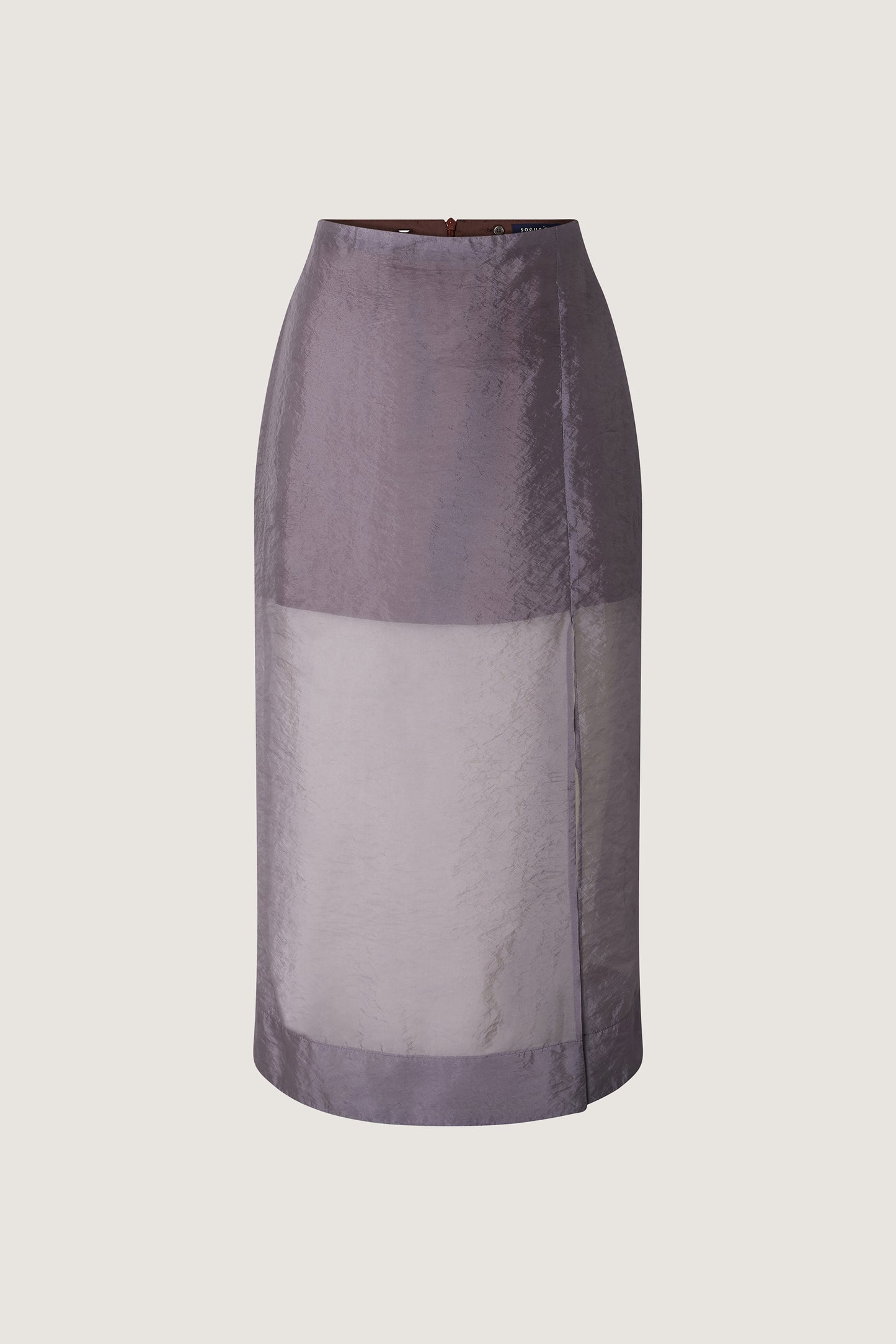Mid-length skirt with side slit in grey organza, the addition of English seams on the outside of the fabric adds structure to this sheer design.